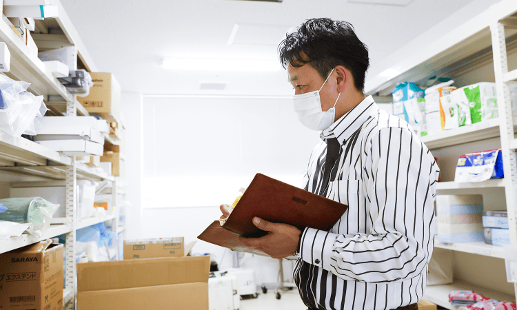 納品する商品を社内の倉庫で準備。「○○病院は注射針の種類が多いから特に注意しよう」「□□クリニックからは昨日、追加のサンプル依頼があったな」など、お客様ごとに、納品書と商品を揃えていきます。